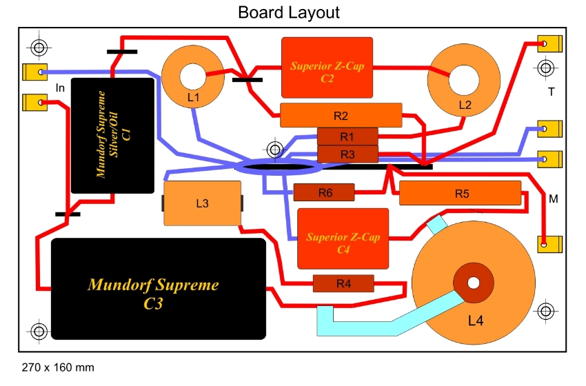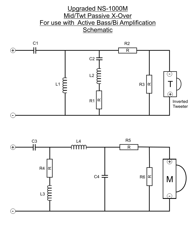 This arrangement allows drivers of mixed impedance to be used. The 8ohm Mid and Twt are driven by a Valve Amp. The 4ohm Woofer is driven by a beefy class D Amp, which gives better control of the driver. I tried various ways of running this, including balanced for bass, but simple worked best and SE paths for both HF/LF used fewer parts and sounded cleaner to me. The hardware I chose, had particular features or attributes that I needed for my set up and I tweaked the units further, to best serve my application, each has its own story and you can jump to them using these links: Schiit Freya Plus Pre Amplifier PrimaLuna ProLogue Four Power Amplifier Nord One UP NC500DM Power Amplifier Passive X-Over After several attempts with the stock circuit, the passive design I chose to use, is basically Troels Grevesens NS-1000M upgrade, his project is linked below. I bought one of his Level 3 kits, which uses Jantzen Superior Z-Caps and used just the Midrange and Tweeter elements from this. It gives a flatter response than the original Yamaha circuit. www.troelsgravesen.dk/Yamaha-NS1000.htm ![]() Due to using only part of Troels kit, I used a slightly different layout to his. ![]() I stuck to the circuit and parts/values supplied in the kit, but made a few Brand changes. I swapped the large Superior Z-Cap in series with the mid driver (C3), with a Mundorf Supreme of the same value. The series cap for the tweeter (C1) was changed for a Mundorf Supreme Silver in Oil. The two resistors in the signal path (R2/R5) were changed to equivalent Pathaudio items. All other Jantzen Superes were changed to equivalent Mills MRA12. In Troels schematic there is an optional resistor to attenuate the Midrange relative to the Bass, I left this out, as I can adjust this balance using my separate amplifiers and active crossover if needed. Because of this omission, the attenuating (parallel) resistor for the Twt, relative to the Midrange (R3), becomes a value not supplied in the kit. This value is down to personal taste and your associated equipment, 8R2 sounded shut in and a 9R1 was just a bit too enthusiastic. I found 8R6 worked best in my set up, made up from an 8R2 + 0R5 Mills but my pairs measured 8R6. I mounted these attenuating resistors high on the tag strip, were they were easily changed. While this combination of parts worked best with my equipment, your requirements may vary. I would start with the supplied parts/values in the kit and go from there, which is what I did. It sounds great in stock form, my changes, to component Brands, made only a very small difference. This was about tailoring these parts to suit the tonality of the rest of my equipment. Troels did a really good job with this circuit design and I can whole heartedly recommend it, over an upgraded stock Yamaha circuit I built for this set up, using similar Jantzen coils and caps. A Completed Passive X-Over Please don't ask me for Troels part values, which I've removed from all pictures and schematics. If you want to know these, buy the kit from Jantzen. It's good value, you would struggle to put equivalent quality parts together for the money. |
