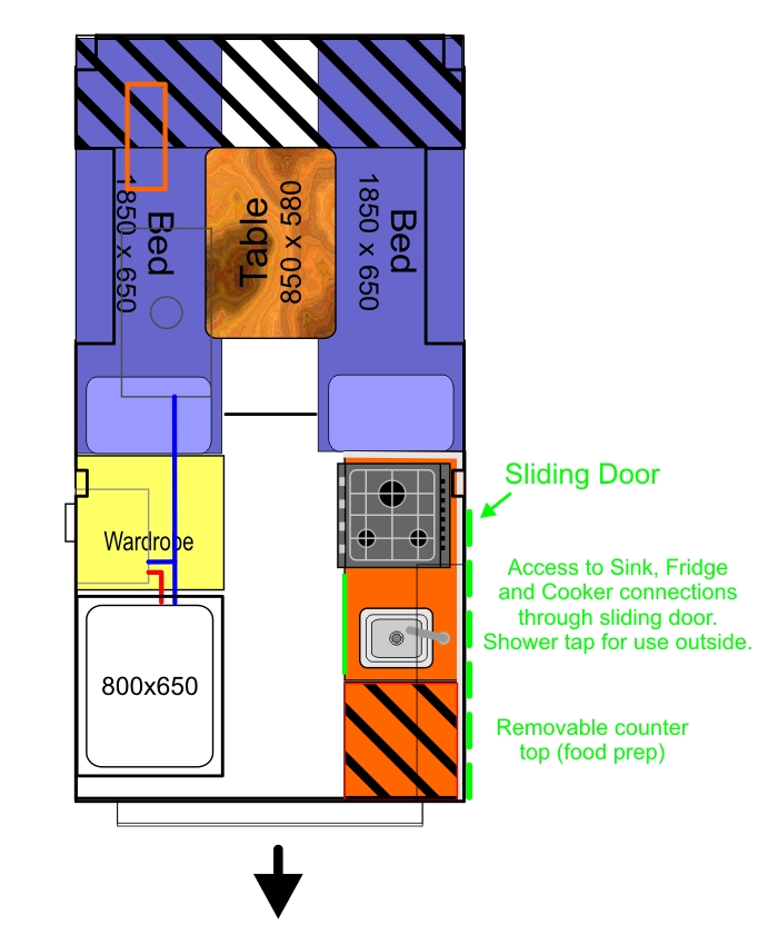 Campervan Conversion (Cammie the Camper) My Approach (Updated April 2025) These are my basic thoughts from the outset, which will no doubt evolve further, along the way...... I'd been gathering useful information for many months prior to buying a vehicle. I spent a good while looking at what other people have done, in the many build projects on YouTube. There was also my own experience, gained while owning a motorhome. My outline thinking for the van, is keep it simple and keep it light weight. Simple does not mean basic though, we will have all the creature comforts, including hot water, a Loo and a shower. There are some ingenious contraptions that people have come up with, folding thingies and clip together what knots, but that's not for us. Having to construct your bed or eating area, every time you use it, then put it away afterwards, is not for us. Ease of use is a major consideration. Some designs have fundamental flaws as far as we are concerned, but realize individuals requirements and priorities can be different to ours, so please don't take offense if you have done things differently. So many builders leave the bulk head in and fit units across the back of it. This maximizes the use of available space, but means if you want to drive off, you have to exit the vehicle to get up front. If there are undesirables around your van at night, it means you might have to confront them before driving away, not something I would want to do as a pensioner. There's a common layout theme, of a double bed across the back, with storage underneath. This works fine for many people, where they are a couple, but what if I want to do a festival or fishing trip with a mate? Two singles is far more versatile, if harder to accommodate, while bunk beds are not an option for us oldies. Safety concerns me, I see some LPG gas installations without any ventilation what so ever. You should have, at the very least, vents in the bottle storage area and in theory, at every mechanical coupling and appliance connection in your layout. You should also have a vent at the lowest point, which is usually at the steps into the van, as LPG is heavier than air and will accumulate at this point if there's a leak. It's no wonder many camp sites don't allow self builds, their insurance companies only want certified vehicles. Personally I couldn't sleep at night in such a death trap. The same goes for Carbon Monoxide (CO) gas, given off by gas hobs and other LPG burners. This gas is lighter than air, so adequate high level ventilation is required to let any that forms, out of the vehicle. These vents must be permanent, something that cannot be closed off. Lithium Iron Leisure Batteries are something I initially dismissed as to much of a fire hazard. Their benefits, in terms of space/weight saving, higher life expectancy and ability to operate with deeper discharge, without ill effect, was never in question. After reading up on the subject, it appears not all Lithium batteries are equal. The type you should use as Leisure batteries is LIP (Lithium Iron Phosphate AKA LiFePO4). These are not the same as car or bike batteries and don't burn as easily. They have many protections built in and are probably less of a risk than Petrol/Diesel fuel tanks or LPG systems. So I am much more comfortable with the idea now. I'm considering a composting toilet, I'm not a card carrying Greenie but like to do my bit. It's actually got more to do with the fact, that in the UK, chemical waste disposal points are few and far between, basically just on established camp sites. I found with two people, I was emptying a Thetford cassette approximately every 3 to 4 days. A separating or composting toilet would extend this period into weeks and have a greater number of disposal options. Storage! Somewhere to store muddy boots, water hose, hook up leads, tools and spares, preferably away from the living space altogether, so in other words, a separate garage area. And lastly maintenance! Presume everything will fail at some point, so maintenance access is also high on the list of design parameters. Don't wall things up, so I'll have to rip half the van apart to get at something. Use trunking for cables and even run some spare lengths, for the items I haven't thought of yet and may need to add later. I've only had the van a week but this is the way things are shaping up: ![]() The hatched area at the back is a vertical, full height storage space. The beds have tunnels that go into this space, to allow a full 6' mattress, with about 6'4" total room. The electrics go into the space at the back, so any switches, displays or indicator lights, can be mounted through the dividing wall. Open the back doors and you have easy access to the gas locker, water filling point and electrical cupboard. Plus all the bits you tend to carry, like a folding table and chairs, for sitting outside, wind brakes, leveling ramps etc. The table in the plan, is part of the dinette style seating arrangement and is hinged off the dividing wall, so it can be swung up when not needed. The water heater will be under the wardrobe space. A 100L water tank under one bed and the leisure battery/s under the other. I've not got walls and struts in there yet, this is just a first bite. Windows either side in the dinning area and in the sliding door, a skylight and smaller skylight/vent over the shower tray. Two decent size solar panels on the roof, the cables entering the rear space, through the roof, on the passenger side rear corner. There will be a mains hook up socket on one rear corner and an external LPG outlet for a BBQ on the opposite rear corner. It's a rough layout that I'll firm up as I go. A good bit of advice I picked up from another builder on-line, is buy your appliances first and build spaces for them and their fixing requirements. Don't build your van, then look for appliances that are the right size to fit what you have allowed. You may have little or no choices available. Anot