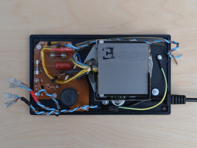 The wires on the left, terminating in spade connectors, attach to the on/off switch in the upper part of the case.