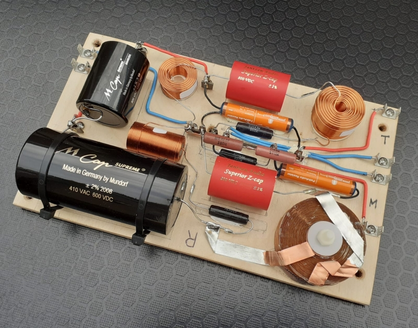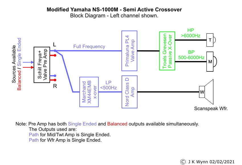 This arrangement allows drivers of mixed impedance to be used. The 8ohm Mid and Twt are driven by a Valve Amp. The 4ohm Woofer is driven by a beefy class D Amp, which gives better control of the driver. I tried various ways of running this, including balanced for bass, but simple worked best and SE paths for both HF/LF used fewer parts and sounded cleaner to me. The hardware I chose, had particular features or attributes that I needed for my set up and I tweaked the units further, to best serve my application, each has its own story and you can jump to them using these links: Schiit Freya Plus Pre Amplifier PrimaLuna ProLogue Four Power Amplifier Nord One UP NC500DM Power Amplifier Passive X-Over After several attempts with the stock circuit, the passive design I chose to use, is basically Troels Grevesens NS-1000M upgrade, his project is linked below. I bought one of his Level 3 kits, which uses Jantzen Superior Z-Caps and used just the Midrange and Tweeter elements from this. It gives a flatter response than the original Yamaha circuit. www.troelsgravesen.dk/Yamaha-NS1000.htm ![]() Due to using only part of Troels kit, I used a slightly different layout to his. ![]() I stuck to the circuit and parts/values supplied in the kit, but made a few Brand changes. I swapped the large Superior Z-Cap in series with the mid driver (C3), with a Mundorf Supreme of the same value. The series cap for the tweeter (C1) was changed for a Mundorf Supreme Silver in Oil. The two resistors in the signal path (R2/R5) were changed to equivalent Pathaudio items. All other Jantzen Superes were changed to equivalent Mills MRA12. In Troels schematic there is an optional resistor to attenuate the Midrange relative to the Bass, I left this out, as I can adjust this balance using my separate amplifiers and active crossover if needed. Because of this omission, the attenuating (parallel) resistor for the Twt, relative to the Midrange (R3), becomes a value not supplied in the kit. This value is down to personal taste and your associated equipment, 8R2 sounded shut in and a 9R1 was just a bit too enthusiastic. I found 8R6 worked best in my set up, made up from an 8R2 + 0R5 Mills but my pairs measured 8R6. I mounted these attenuating resistors high on the tag strip, were they were easily changed. While this combination of parts worked best with my equipment, your requirements may vary. I would start with the supplied parts/values in the kit and go from there, which is what I did. It sounds great in stock form, my changes, to component Brands, made only a very small difference. This was about tailoring these parts to suit the tonality of the rest of my equipment. Troels did a really good job with this circuit design and I can whole heartedly recommend it, over an upgraded stock Yamaha circuit I built for this set up, using similar Jantzen coils and caps. A Completed Passive X-Over Please don't ask me for Troels part values, which I've removed from all pictures and schematics. If you want to know these, buy the kit from Jantzen. It's good value, you would struggle to put equivalent quality parts together for the money. |